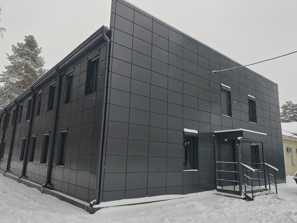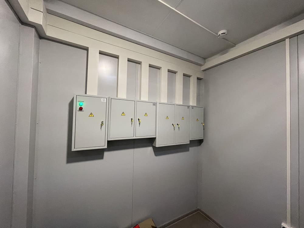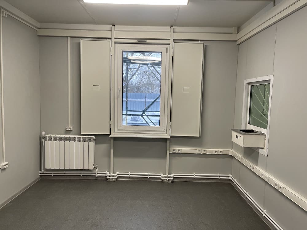 Очередной нестандартный проект. Отделка фасада металлическими кассетами собственного производства, внутренние стены усилены металлическим листом и решеткой, отделка стен панелями гипсоакрил и плиткой, отделка потолка СМЛ панелями. Здание оборудовано автоматическими усиленными рольставнями (4 класс). Часть помещений имеют бронированные окна и двери.