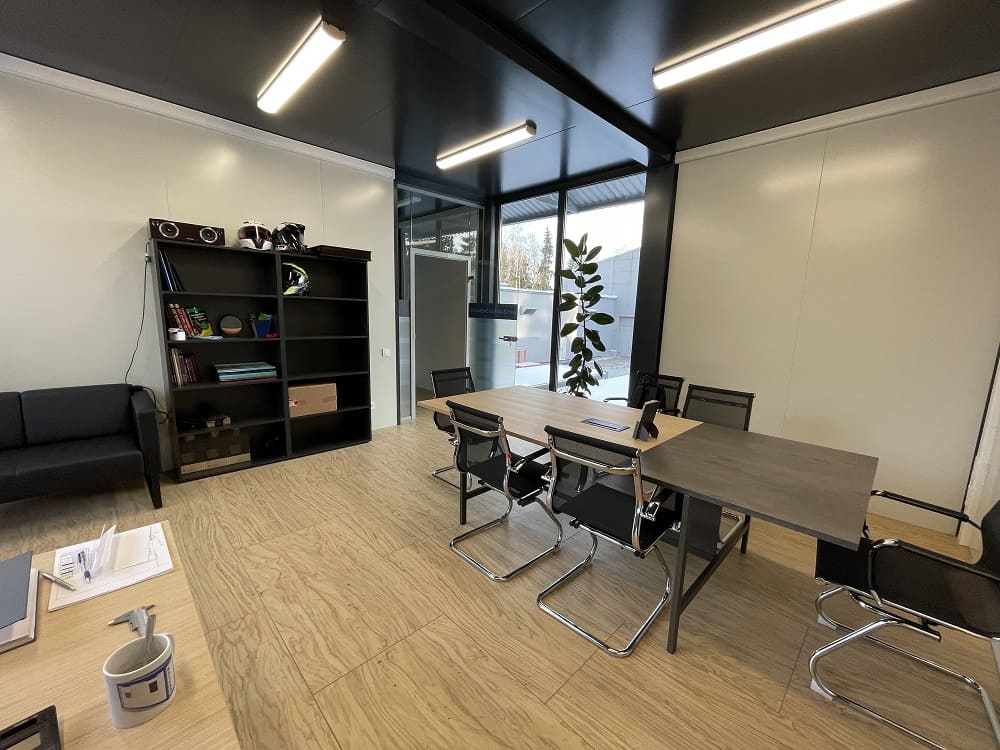 На существующий офис надстроили второй этаж, сделали интересную отделку.